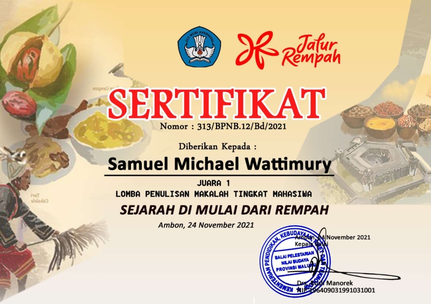 - Juara 1 Lomba Penulisan Makalah Tingkat Mahasiswa: Sejarah di Mulai Dari Rempah